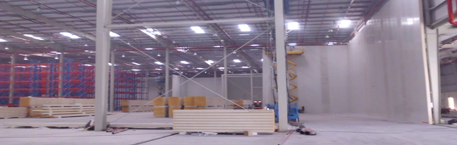 NAME OF PROJECT: Refrigeration and Air Conditioning system H2A warehouse-1 Logistics Village, Doha Qatar. Cold room Panel Installation work LOCATION : Doha Industrial Area BUILT UP AREA : 14,500 Sqm CHAMBER HEIGHT : 13m SCOPE OF WORK RENDERED BY OUR COMPANY : Installation of 200mm thick & 13.0m high PU panel (cold room) for the cold store of Gulf Warehousing Company at Logistics Village Qatar.